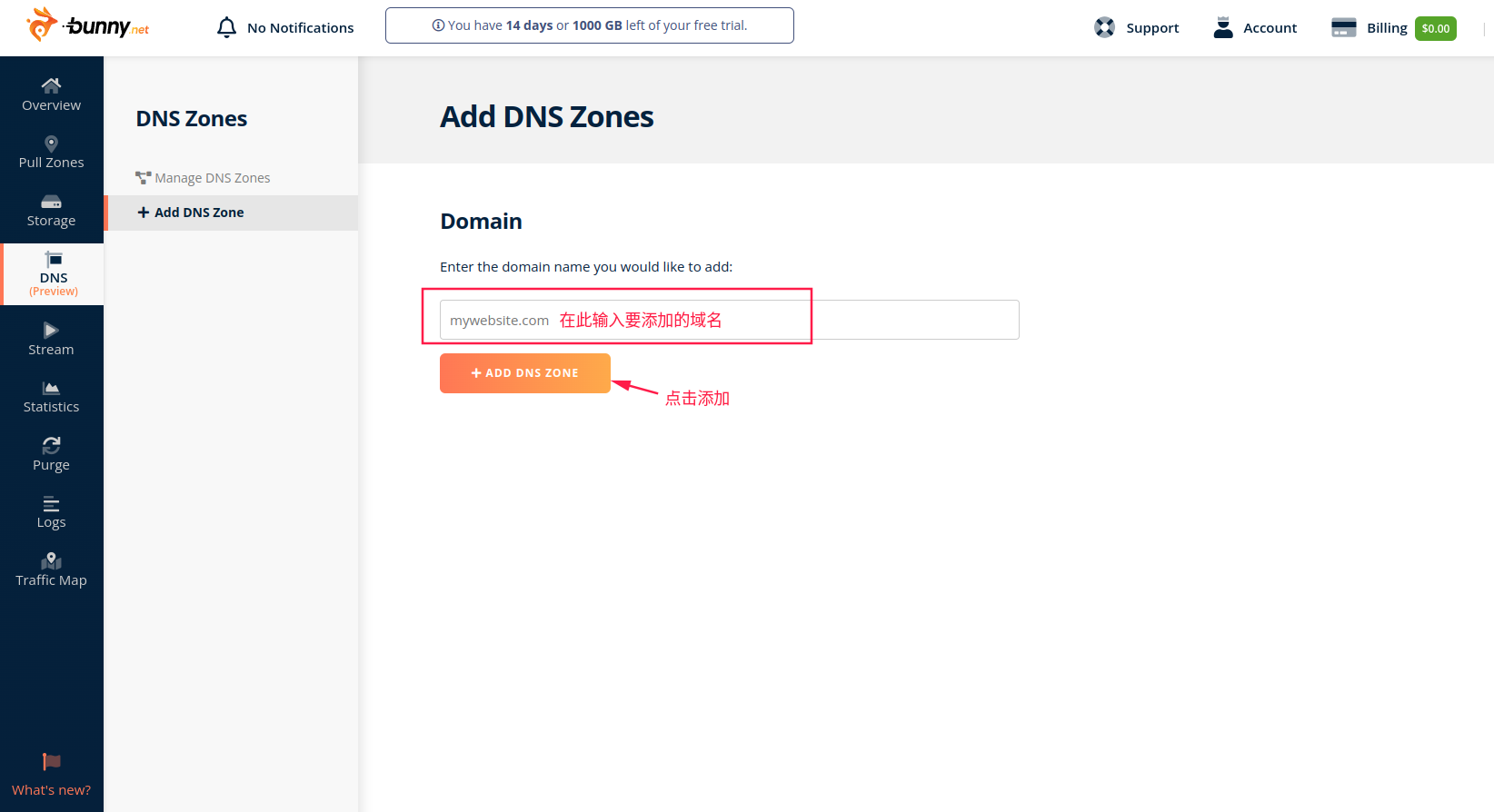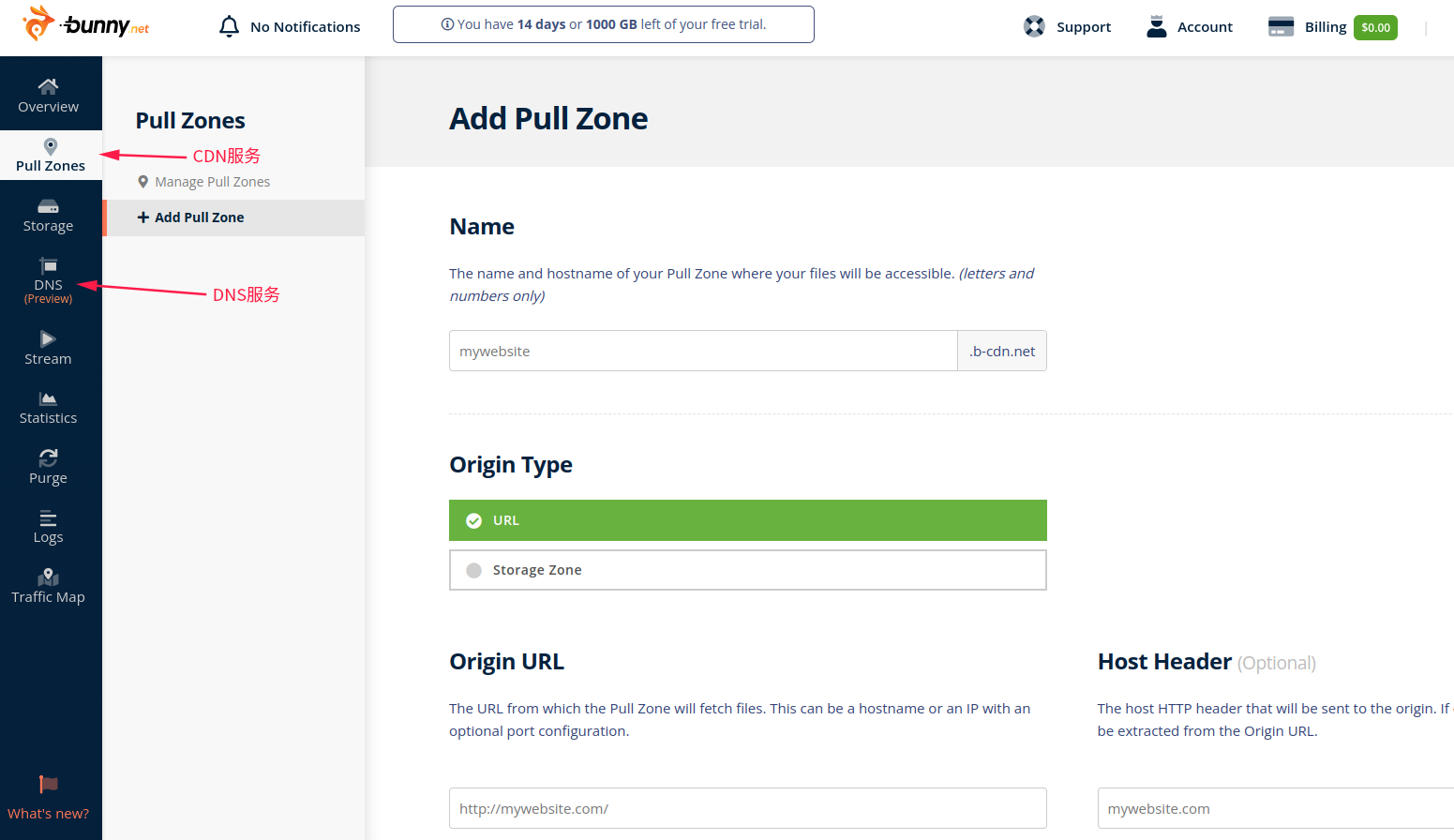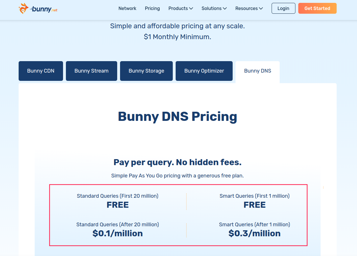 bunny.net 始于 2014 年,总部位于欧洲,提供CDN,云存储,DNS等互联网基础服务。新注册用户提供14天免费试用服务,无需绑定支付方式,注册即用。但是相应的,他们提供的服务大部分是收费,我们今天主要讲到的DNS每个月提供2000万普通请求,100万智能请求服务,超过免费额度后,付费使用,普通请求0.1$/一百万个,智能请求0.3$/一百万个。价格不算贵,但是结算最低消费是1美元。所以只要超过免费额度,计费结算就是从1美元开始。不过正常个人网站使用,免费额度应该完全足够。如果害怕被超额计费的,可以自己思量是否折腾。