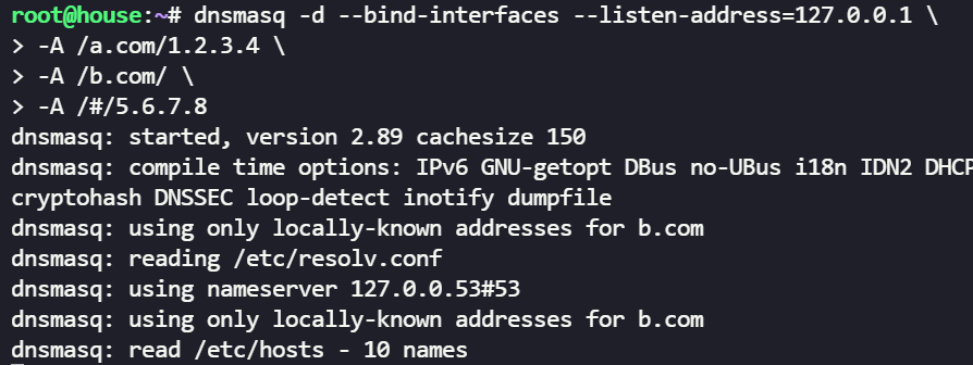 dnsmasq -d --bind-interfaces --listen-address=127.0.0.1 -A /a.com/1.2.3.4 -A /b.com/ -A /#/5.6.7.8